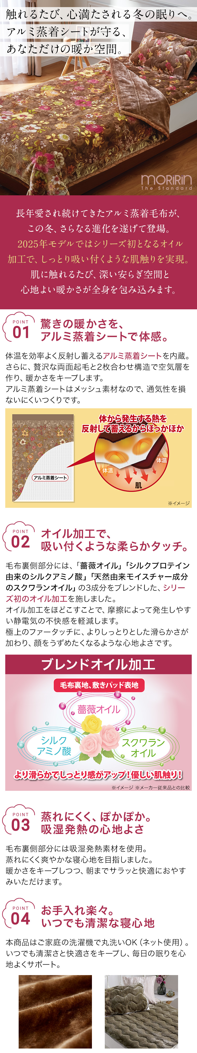 さらに本商品は肌側毛布に”薔薇オイル”シルクプロテイン由来のシルクアミノ酸””スクワランオイル”の3成分を配合したオイルで加工し、しっとりとした肌触りに仕上げました。