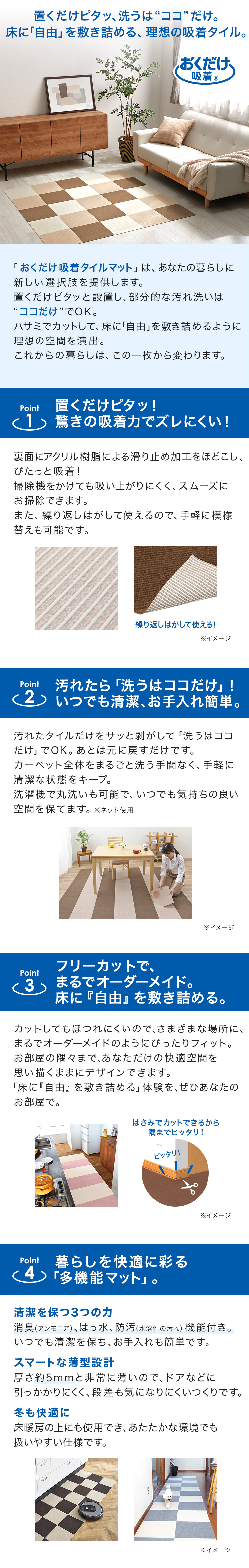 “絨毯のお手入れが大変! つまずく、滑る!”、“フローリングで滑る、足腰に負担がかかる”などのお客様の悩みから開発した「おくだけ吸着」シリーズより、消臭(アンモニア)、はっ水、防汚(水溶性の汚れに対する)機能の付いたタイルマットのご紹介です。