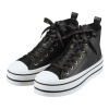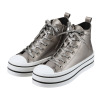 光沢感のある素材とラメ入りシューレースがモードな印象。脚長見せ×こなれ感を両立する万能スニーカー。