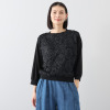 チュールの透け感とラメの上品な輝きが融合。襟元から袖口まで、異素材の調和がもたらす新しいエレガンス。