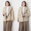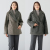 カーリーヘアボア使いのフードによりお顔周りを華やかに。軽やかで暖かなフェイクムートンを使用した一着。