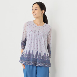 ブルーの柄が気に入り購入しました。商品が到着して袋を開けた時、パワーネットのにおいがしましたが、着てみるとそこまで気にならない感じでした。袖が七分袖で裾がフワッとして私好みの形でした。サイズもいつも通りのLサイズでぴったり。身ごろが二重になっているとは言え透け感があるので下着の上にタンクトップを着る必要がありそうです。これからの季節はカーディガンを上から羽織って着るようになりそうです。